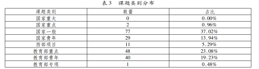 课题类别分布情况如表3所示,其中国家级课题(包括西部课题)占比57.21%,部级课题占比42.79%,国家重点课题偏少,国家重大课题缺失。可见,我国民族教育研究者尚需在国家重大项目上有所突破,在重点项目上也需进一步努力。