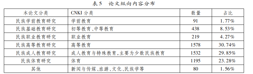 接下来再看内容分布。先看论文纵向内容分布,从CNKI自带的文献分类得到如表5所示分布情况。
