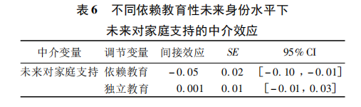 依据方程3的检验结果,采用简单斜率进一步分析依赖教育性未来身份的调节作用,如图2所示,未来身份依赖教育条件下,未来对家庭支持显著正向预测学习投入(B=0.84,SD=0.25,p<0.001,95%CI[0.35,1.34]);未来身份独立教育条件下,未来对家庭支持不能显著预测学习投入(B=0.08,SD=0.28,p=0.37,95%CI[-0.48,0.63])。最后考察在调节变量不同水平下的中介效应,如表6示,家庭经济收入通过未来对家庭支持对学习投入的间接影响受到依赖教育性未来身份的调节,与未来身份独立教育条件相比,家庭经济收入在未来身份依赖教育条件下通过未来对家庭支持对学习投入的间接影响更大。