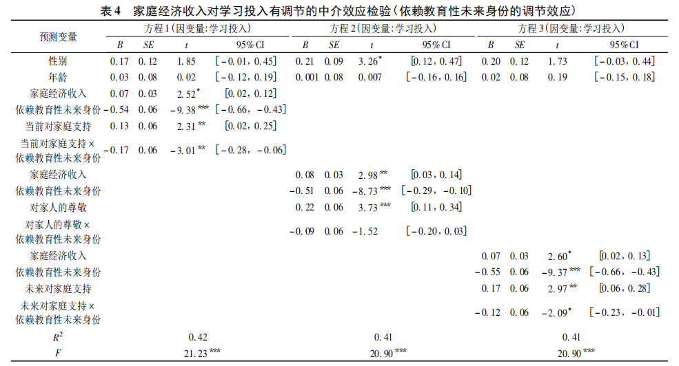 如表4所示,在控制性别和年龄后,方程1中,当前对家庭支持显著正向预测学习投入(B=0.13,SE=0.06,p=0.008,95%CI[0.02,0.25]),b1显著;家庭经济收入显著正向预测学习投入(B=0.07,SE=0.03,p=0.01,95%CI[0.02,0.12]),c1’显著;当前对家庭支持与依赖教育性未来身份的交互项显著预测学习投入(B=-0.17,SE=0.06,p=0.003,95%CI[-0.28,-0.06]),b3显著。这说明依赖教育性未来身份显著调节当前对家庭支持在家庭经济收入和学习投入之间的中介作用。方程2中,对家人的尊敬显著正向预测学习投入(B=0.22,SE=0.06,p<0.001,95%CI[0.11,0.34]),b1显著;家庭经济收入显著正向预测学习投入(B=0.08,SE=0.03,p=0.003,95%CI[0.03,0.14]),c1’显著;对家人的尊敬与依赖教育性未来身份的交互项未能显著预测学习投入(B=-0.09,SE=0.06,p=0.13,95%CI[-0.20,0.03]),b3不显著。这说明依赖教育性未来身份未能显著调节对家人的尊敬在家庭经济收入和学习投入之间的中介作用。方程3中,未来对家庭支持显著正向预测学习投入(B=0.17,SE=0.06,p=0.002,95%CI[0.06,0.28]),b1显著;家庭经济收入显著正向预测学习投入(B=0.07,SE=0.03,p=0.01,95%CI[0.02,0.13]),c1’显著;未来对家庭支持与依赖教育性未来身份的交互项显著预测学习投入(B=-0.12,SE=0.06,p=0.04,95%CI[-0.23,-0.01]),b3显著。这说明依赖教育性未来身份显著调节未来对家庭支持在家庭经济收入和学习投入间的中介作用。