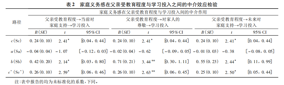 采用SPSS宏程序PROCESS的模型4检验家庭义务感在父亲受教育程度(家庭经济收入)与学习投入之间的中介作用(性别和年龄为控制变量)(Hayes,2013)。如表2所示,父亲受教育程度显著正向预测学习投入,c=0.24,p=0.02;父亲受教育程度未能显著预测当前对家庭支持,a=-0.04,p=0.29;同时纳入父亲受教育程度和当前对家庭支持后,父亲受教育程度显著正向预测学习投入,c’=0.26,p=0.01;当前对家庭支持显著正向预测学习投入,b=0.42,p=0.04。这说明当前对家庭支持在父亲受教育程度和学习投入之间不起中介作用。父亲受教育程度未能显著预测对家人的尊敬,a=-0.02,p=0.54;同时纳入父亲受教育程度和对家人的尊敬后,父亲受教育程度显著正向预测学习投入,c’=0.26,p=0.009;对家人的尊敬显著正向预测学习投入,b=0.71,p=0.001。这说明对家人的尊敬在父亲受教育程度和学习投入之间不起中介作用。父亲受教育程度未能显著预测未来对家庭支持,a=-0.01,p=0.70;同时纳入父亲受教育程度和未来对家庭支持后,父亲受教育程度显著正向预测学习投入,c’=0.25,p=0.01;未来对家庭支持显著正向预测学习投入,b=0.55,p=0.01。这说明未来对家庭支持在父亲受教育程度和学习投入之间不起中介作用。