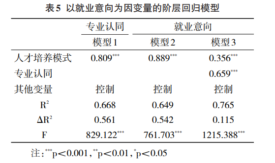 为检验“人才培养模式-专业认同-就业意向”路径中各变量之间是否具有线性回归关系,本研究首先采用阶层回归分析,在对其他变量进行控制的基础上,构建模型1—模型3进行检验,结果如表5所示: