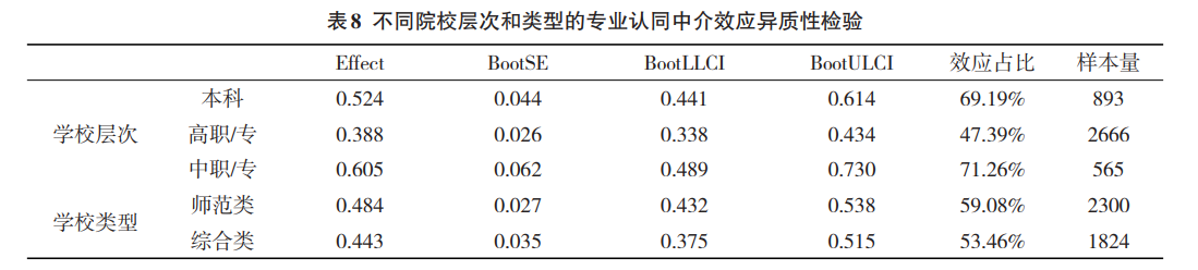 以上验证了人才培养模式与就业意向之间的正向线性相关关系、专业认同及其各维度的中介效应。本部分将样本学生根据院校层次和类型进行划分,以探寻专业认同中介效应的异质性见表8。