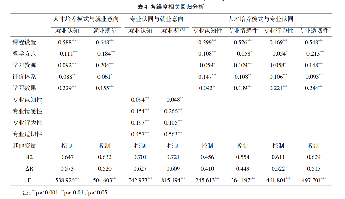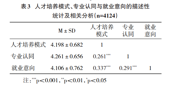 进一步对人才培养模式、专业认同和就业意向各维度进行相关影响分析,以探寻不同维度间相关性及影响程度的差异。(如表4所示)