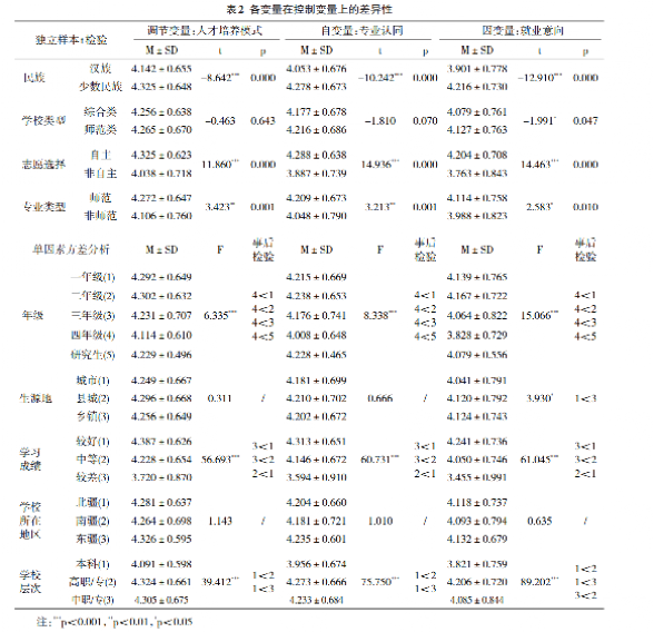 具体来看,人才培养模式、专业认同和就业意向在不同变量上存在差异: