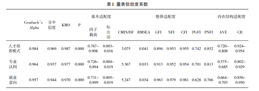 就业意向是中高等院校学生在专业学习过程中逐步产生的与未来就业相关的观念倾向,主要包含就业认知、就业期望和就业结果三个构成要素[5]。由于本研究调查对象为各年级在校生,并未涉及实际的就业结果,因此提取就业认知和就业期望两个观测指标,参考韦颖[25]针对民族地区院校学生就业意向的实证调查,结合学前教育专业就业实际问题形成《民族地区院校学前教育专业学生就业意向调查问卷》,共11个题项,以此评估学生对民族地区院校学前教育专业就业的总体判断和态度(形式认识、政策支持和干扰因素)以及未来在民族地区学前教育领域就业的倾向和期望(职业规划、就业方向、职业选择、就业地区、薪资期望)。量表Cronbach’sα=0.957,KMO=0.970,因子载荷量介于0.731-0.899,CMIN/DF=5.247(p<0.01)、RMSEA=0.034、GFI=0.963、NFI=0.979、CFI=0.981、PGFI=0.628、PNFI=0.766,CR介于0.856-0.950、AVE介于0.664-0.703,量表具有较高的内部一致性,整体拟合效果较为合理,聚敛效果理想。