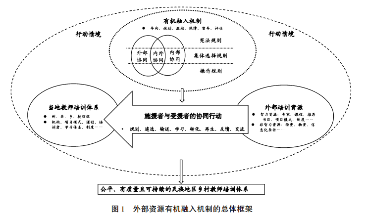 综上分析,本文针对外部培训资源与当地受援者之间存在适切性不够、系统性不足、持续性不强、再生较少等问题,提出“外部资源有机融入”这个本土化的概念,并借鉴制度理性选择理论,从中央层面宪法规则、地方各级政府和机构层面集体选择规则以及帮扶双方个体操作规则三个层次以及内部、外部、内外部之间三个协同,对外部资源有机融入民族地区乡村教师培训体系所需要的机制进行构建,并尝试进行以制度为中心的纵贯分析和协同分析。基于制度理性选择理论并进行一定的拓展延伸,建立如下能够反映在有机融入机制与协同行动作用下外部资源与民族地区乡村教师培训体系各要素有机整合的逻辑关系图(见图1)。