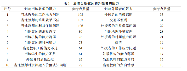 但是,部分理性诉求并未得到充分满足,会使外部资源有机融入的协同行动遭到阻碍。主要是:(1)根据生存理性诉求,民族地区一线、骨干教师由于工作压力而参加培训者学习的积极性不足,影响外部资源的融入效果。但当地教师的职业晋升、工学矛盾、时间精力不足、生活负担重等问题导致工作压力增加,以至于有的老师不愿意参加外部帮扶的培训。“教学压力太大了,如果出不了成绩,下一年竞聘就可能漏评。”(A21)“可能是(因为)职业倦怠。”(A24)在扎根理论分析中通过NVivo20对阻力参考点进行统计,当地教师的工作压力问题参考点数量最高(见表1)。如要他们成为当地培训者,与外部专家学习培训,就要承担教学和培训双份工作,如县里没减免工作量、评奖和职称倾斜等政策支持,不少老师是犹豫的。即使是参加教育部国培计划培训者研修团队的骨干教师,同样会缺乏与外部专家持续学习的动力。