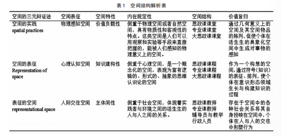 空间社会学作为从社会视域下对空间的秩序进行探寻的社会学分支学科,是从空间视角对社会现象进行阐释的研究。关于空间的研究最初可追溯到马克思、恩格斯对于资本主义社会的批判,他们认为资本主义的兴起过程就是在全球范围内占有、控制、重组并利用空间的过程[12],将空间视作地理意义上的物质形态进行了探讨。之后,齐美尔探讨了社会中的空间问题,认为社会意义上的空间本质上是以约束性、规定性、排他性和分割性为特质的个体或群体的“心灵空间”[15],探讨了“空间的秩序”即心灵认知视角下的空间,在马克思、恩格斯对“社会的空间”(物理意义上的空间)的研究基础上赋予了空间心理属性和符号属性。在此基础上,列斐伏尔将主体性引入空间研究,创造性地提出了“空间生产理论”,认为整个社会空间是从身体开始,进而透过意象和象征被直接生活出来,即空间可划分为空间的实践(物理感知空间)、空间的表征(心理认知空间)、表征的空间(人际交往空间)三个维度[14],这三个维度各有侧重但又协调统一、共生发展,成为“空间三元辩证法”的重要组成部分(如表1所示)。由此,空间社会学视域下的“空间”既涵盖了物理范围的广延,又内含了心理范围的蔓延,并被赋予了社会本体论的地位[13],为研究铸牢中华民族共同体意识教育空间在整个学校思想政治教育空间内的逻辑结构提供了新的理论视角。
