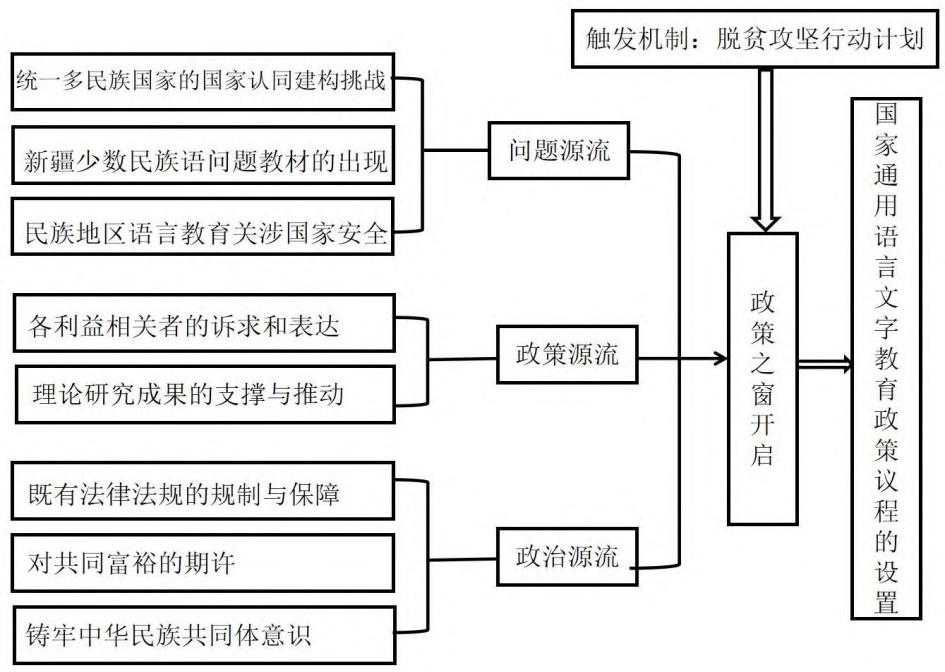 问题源流常借助指标、焦点事件、反馈信息引起政府与公众的关注,从而引发政策制定者的思考和决策[12]。在国际形势复杂多变的情况下,我国统一多民族国家的国情和多语言多文种的语情使得国家认同建构更具紧迫性。在此背景下,2016年的新疆“毒教材”形成焦点事件,将公众注意力导向至民族教育系统中可能存在的意识形态问题,引发了公众对国家通用语言文字教育的关注和讨论。语言安全与国家安全的联系反馈至决策者视野,进而推动国家通用语言文字教育政策的出台。