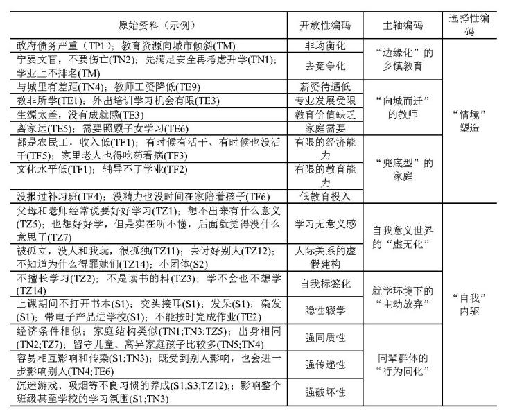本研究的资料分析与处理大致可分为三步:首先,由团队成员对所有原始资料进行阅读,并讨论资料中涌现的大致主题;其次,团队成员分别对3/4的资料进行三轮编码,并就各自的编码结果进行充分对比与讨论以确保编码结果的一致性和可靠性;最后,采用扎根理论检验理论饱和度的一般方法,对剩余的1/4资料进行标记、编码,发现没有出现新的概念,从而得知数据达到饱和。本研究采用程序化扎根理论三级编码的方式展开。笔者对受访人所表达的内容进行编码,提取出16个开放编码。在开放编码的基础上进一步分析、聚类,又提炼出“边缘化”的乡镇教育、“向城而迁”的教师、“兜底型”的家庭、自我意义世界的“虚无化”、就学环境下的“主动放弃”、同辈群体的“行为同化”六个主轴编码。经过进一步的分析和聚类,这六个主轴编码又可以分为两个核心类属,其中“边缘化”的乡镇教育、“向城而迁”的教师、“兜底型”的家庭主要体现了外部情境塑造,而自我意义世界的“虚无化”、就学环境下的“主动放弃”、同辈群体的“行为同化”则体现了内部自我内驱,从而形成了“情境”塑造和“自我”内驱两个核心类属(见表2)。