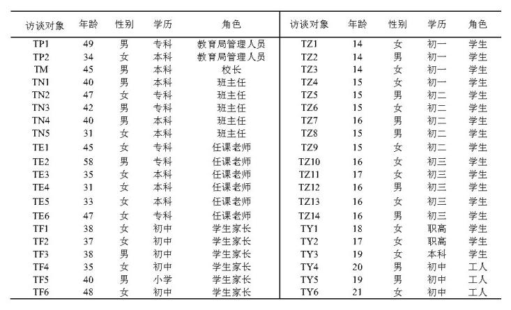 本研究的资料收集包括半结构化访谈和参与式观察两种方式:半结构化访谈主要采取现场多对一的方式对县教育局工作人员以及D中学的校长、班主任、任课老师、学生、家长进行了40次的深度访谈,并且对6位已从D中学毕业的学生就其当前的生活和工作情况进行访谈。46位访谈对象的具体情况如下(见表1)。访谈过程由一位研究者主访,而后再由其他研究者做补充性访谈,每次访谈时间约为60分钟,依据访谈对象意愿并未对访谈内容进行全程录音录像,但每位研究者均对访谈对象的回答进行了文字记录,每次访谈结束都将文字记录交由访谈对象查看,确保记录内容的完整性与真实性。针对不同的访谈对象设计了差异化的访谈提纲,请受访对象根据自己的实际情况进行回答。参与式观察选取D中学学生部分上课时段(用S1编码)、娱乐时段(用S2编码)、在家时段(用S3编码)进行参与式观察,形成了初中生群体近2万字的生活史资料,并结合研究者的体验,以综合化、理论化、结构化的形式表达。