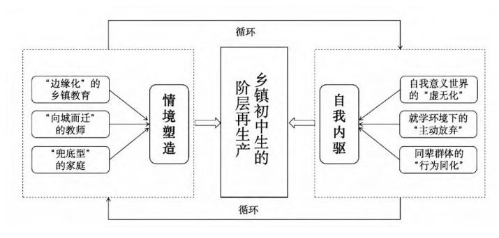 综上所述,西部乡镇初中生阶层再生产不仅受客观上教育结构、教师结构和家庭结构等外力影响,同样也是主观上自我同意和自我选择的结果。也就是说,阶层再生产逻辑在“情境塑造-自我内驱”的共同作用下得以产生(如图所示)。