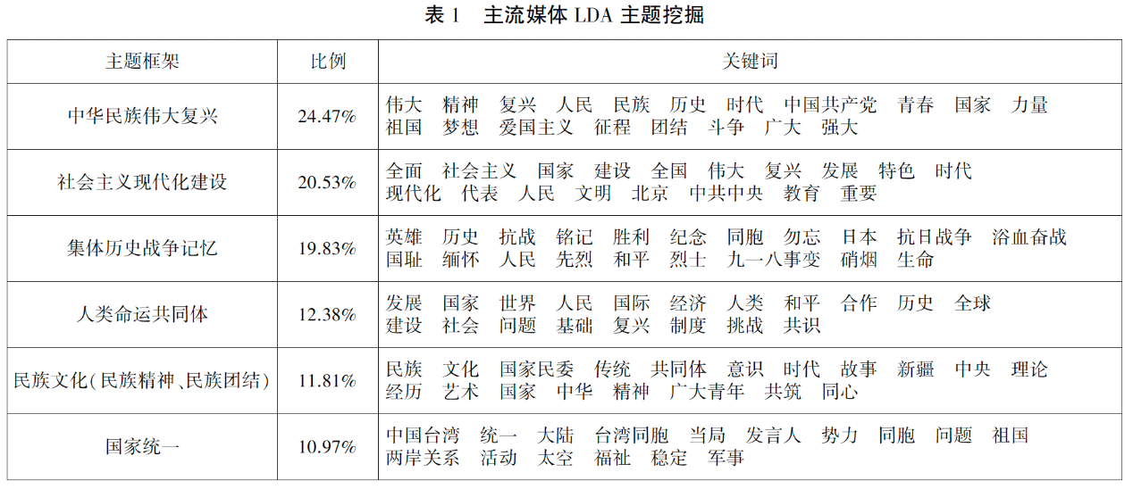 主流媒体账号发布的内容涵盖了六个主题框架,比例前三的分别是中华民族伟大复兴(24.47%)、社会主义现代化建设(20.53%)和集体历史战争记忆(19.83%)。人类命运共同体(12.38%)、民族文化(民族精神、民族团结)(11.81%)和国家统一(10.97%)亦占据一定比例。从对历史战争的回顾和集体记忆建构,到对当前社会主义现代化建设的展现,对民族文化的解读,对国际关系及人类命运共同体的关注,再到对完成国家统一,实现中华民族伟大复兴中国梦的宣传引领,主流媒体通过六个主题框架铺展了一张精心构建的涵盖“过去—现在—将来”的中华民族共同体图谱。